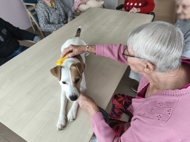 L’attention portée au chien, en particulier lorsqu'il est brossé, participe également à réduire l’anxiété, à apaiser le stress et à améliorer l'humeur des personnes âgées. En somme, prendre soin d'un chien en EHPAD est une activité bénéfique pour la santé mentale et physique des résidents, tout en renforçant le lien entre l’humain et l’animal.