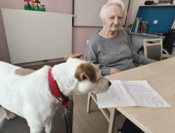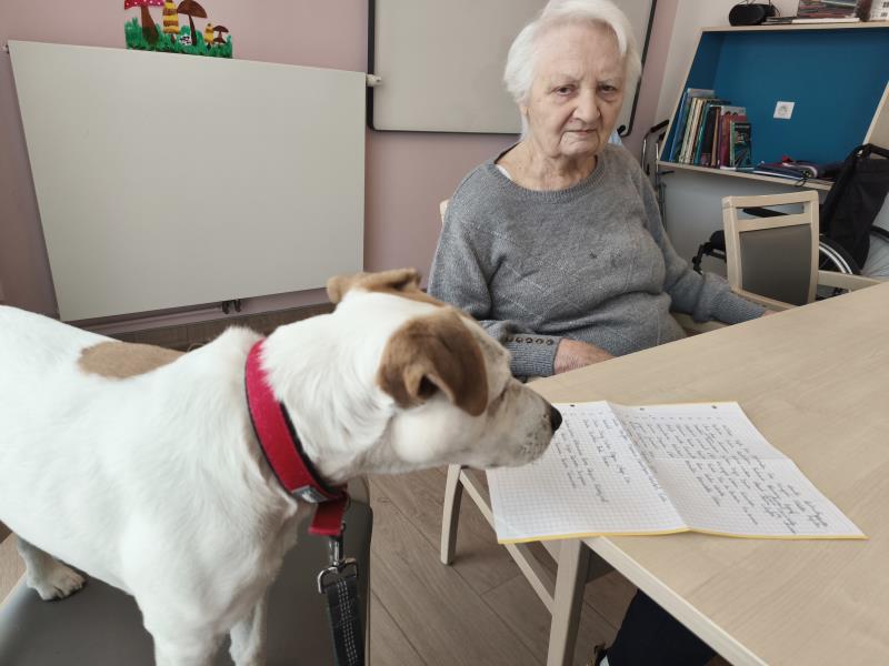 Les résidents de l'unité de vie protégée ont planché sur le "petit bac des animaux": à partir des lettres de l'alphabet, il fallait retrouver un maximum de nom d'animaux. Certains sont familiers, d'autres plus exotiques, et quelques uns totalement inconnus! Sherlock a contribué à sa manière à cette recherche: il était notamment réactif au mot "chat" (associé très certainement aux félins qu'il pourchasse parfois...) et "cochon" (son jouet en caoutchouc favori) Par contre, la baleine, l'autruche et l'anaconda l'ont laissé de marbre !
