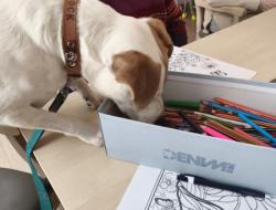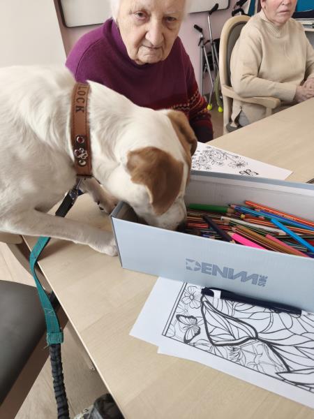 Cela fait désormais un an tout juste que Sherlock intervient comme chien médiateur dans la résidence, et il prend son rôle très au sérieux: ce matin, il a choisi les couleurs nécessaires pour l'expression créative. Les résidents ont apprécié ses choix et ont suivi l'activité en compagnie de leur ami quadrupède un peu espiègle.